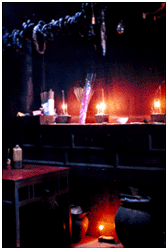 我們的家族神是「察那跟頂西」﹐只有兩家。我們並沒有很直接的親戚關係﹐只是共一個神。不僅家族神如此﹐在三組那兒﹐一個組一個團團﹔它是跟著地域那樣劃﹐而不是跟親戚劃﹐就是「巴個」。他們那一個「巴個」﹐整個一下(按﹕「一下」就是全部的意思)﹐都是一個神﹔一個坪坪那(按﹕「坪坪」指山邊上的平台地)﹐「巴個」。那有好幾個這樣的神。親屬關係﹐最初是一家人分的﹐分下來時間再長﹐還是一個神分下來的。分到那﹐都供這個神。還有就是﹐我們上頭那家﹐原來他們房子在那兒﹐這時我們是一家人。他們搬到那去後﹐就是另一家子的神了﹐就供兩個神。 |