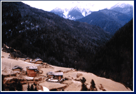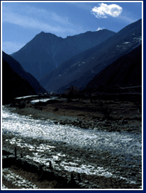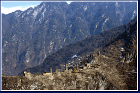 松潘小姓溝的高山村寨,背後的雪山是「格日曩措」山神所居。山神就是羌族口傳故事中所謂的「山神菩薩」。在村寨當中,千白年來的傳說,祖先一輩一輩的告訴下一代,山坡是如何傳下來的,敬山神的目的是為了要知道自己的地盤。 |