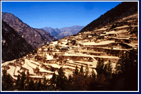 日常生活在羌族村寨中的居民有這樣跨大的形容─人的鼻頭都要扣到前面路上了。由於地形的關係,從居民所居住的地點來看,就宛如一層層的階梯。 |