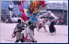 乍然一看,誤以為是漢族舞龍舞獅的慶典,但服裝似乎不是。茂縣牛尾巴羌族的年?儀式:舞龍。當地龍的信仰,是一種合本地傳說與漢文化因素頭的民間信仰。 |